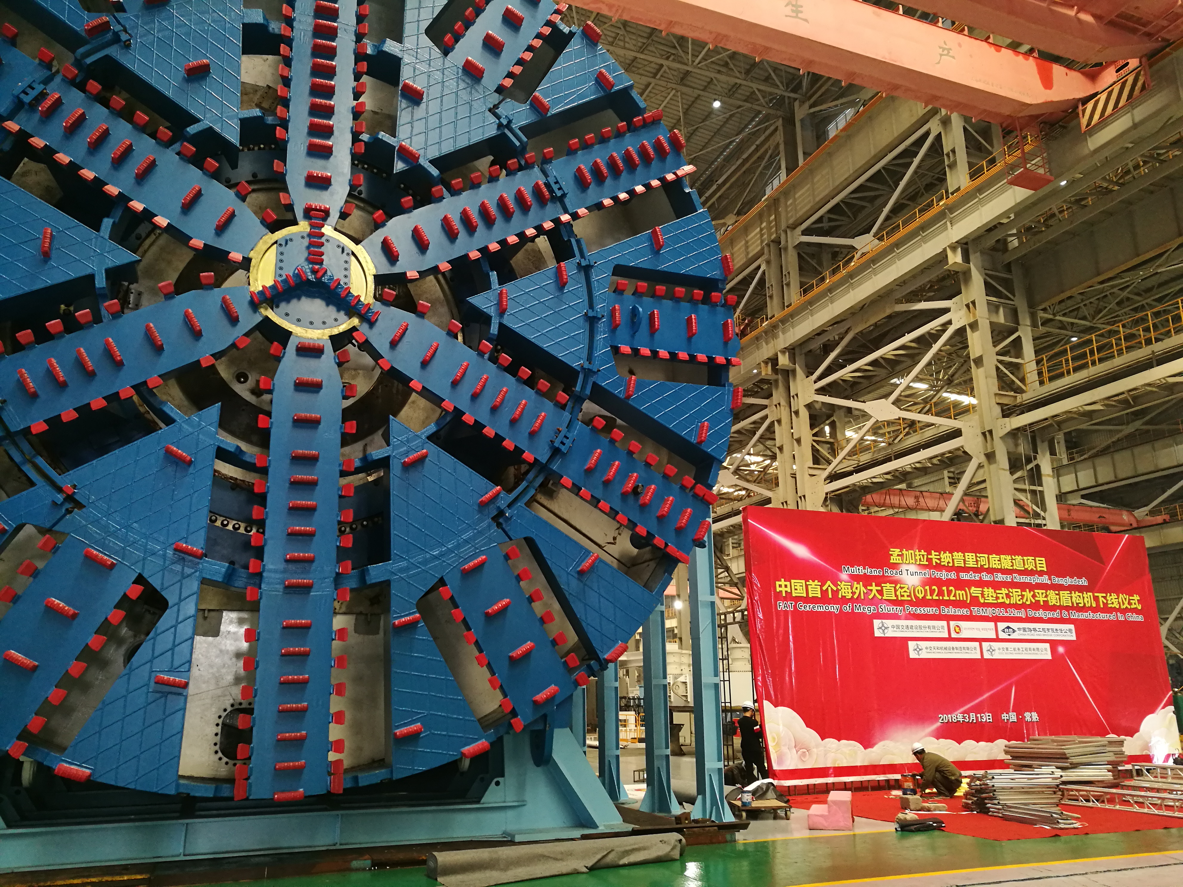 3月13日,由中交天和自主研制的中國出口海外大直徑盾構(gòu)機(jī)在江蘇常熟成功下線,盾構(gòu)機(jī)刀盤直徑達(dá)12.12米、長94米、重2200余噸,是南亞地區(qū)大直徑的盾構(gòu)機(jī)。該盾構(gòu)機(jī)將用于中國在海外大的盾構(gòu)公路隧道項(xiàng)目--孟加拉卡納普里河底隧道工程,打破了由發(fā)達(dá)國家對海外超大直徑盾構(gòu)市場的壟斷,標(biāo)志著中國盾構(gòu)機(jī)設(shè)計(jì)研發(fā)能力達(dá)到了領(lǐng)先水平。